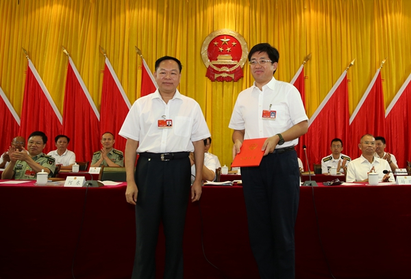 市人大常委会主任徐学健(左)向新当选市长阿东颁发任命证书后合影